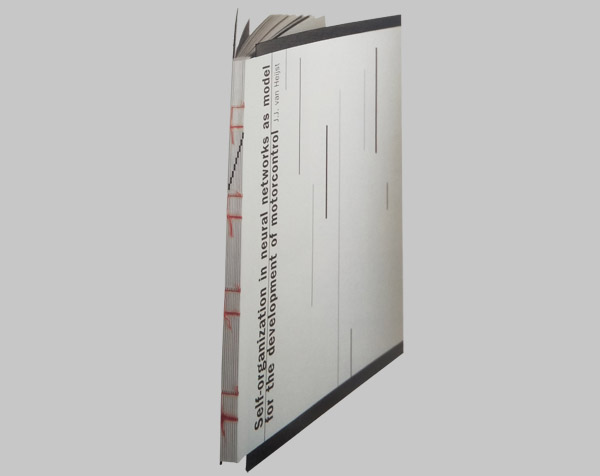由于這本畫冊是關于神經系統的,所以設計師把書脊作為設計的著重點。在書脊部分不用常規采用的自線,而是采用明亮的紅線釘縫,線頭外露。這樣,原本在裝訂過程作為書脊的內部結構,在這里完全暴露給讀者,轉而成為具有極強視覺沖擊力的地方。
