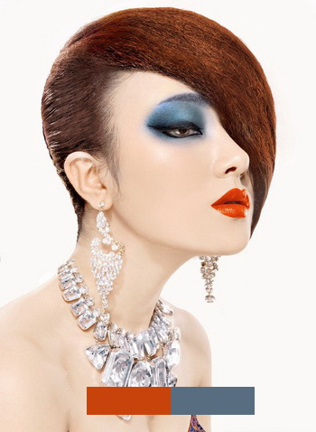 高飽和度的橙紅色唇妝和低飽和度的桔棕色發色搭配,使原本暗淡沉寂的妝容立顯華美光鮮。因此,這款妝面是通過恰當的補色運用和高低飽和度對比運用達到畫面和諧的。