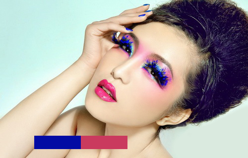 桃紅色是紅色中加入了少量的紫色調和而成的,在色相環中,與緊鄰的藍色形成對比關系。桃紅色浪漫艷麗,藍色冰爽清涼,兩種亮色碰撞如冰火相溶,視覺上對比強烈。用藍色花紋羽睫粘在眼部,用桃粉色眼影大面積暈染眼瞼,使妝面于強勢中帶著一股柔媚的氣質。小面積翠綠色眼影和淺藍色的背景呼應,使整個畫面既個性冷艷,又亮麗清爽,又有視覺上的沖擊力。