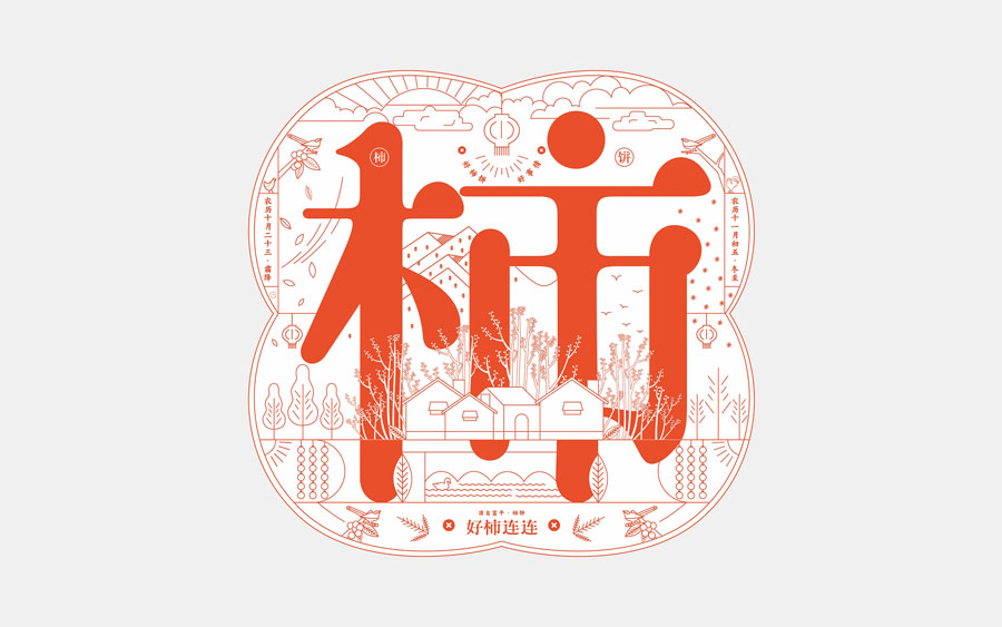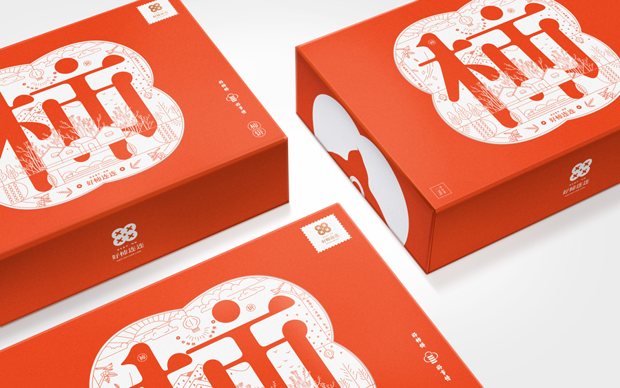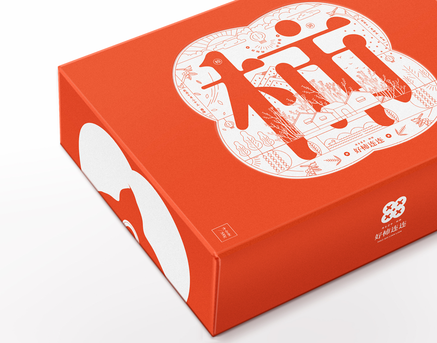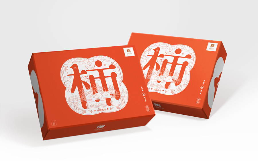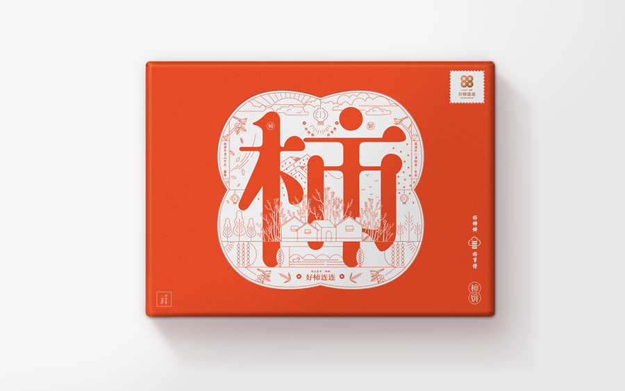 為了契合好柿餅好事情的產品理念,我們在設計上,力求營造這一品牌氣質,同樣的吸收原料篩選的嚴謹苛刻,注重品質感和形態視覺美學的精雕細琢,為了保證純正天然的視覺感受,包裝整體以柿子天然色作為主體色,在其正面,以柿子的剪影作為整個包裝的視覺中心,圍繞其我們創作了優美線條感的圖形,描述了柿餅形成的兩大節氣過程-霜降和冬至,簡潔的線條概括了好柿餅的升華過程,在畫面的最中心是富平生態農家田園風的生態景觀,底部是富平石川河的描述,簡潔凝練的線條,營造出了富有詩意的品牌氣質,同時講述了好柿連連的品牌故事。在包裝的標識部分,我們運用了郵票的形式,意在強調產品的獨一無二,私人定制性和專屬性,最好的產品屬于追求最好的你,將最好的柿餅送寄給你,為你帶了好事情好運氣。