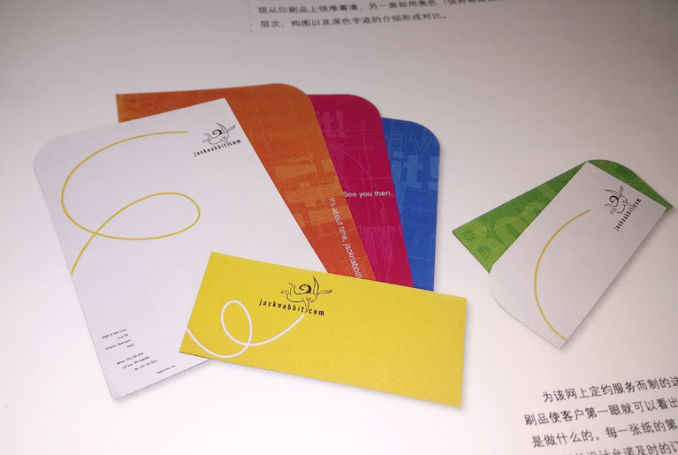 每一張紙第一面設計都以簡介為期特色,公司標語和一條螺旋形的線條搭配和諧,令人愉快,而網站“.com”名字上的微小紅色圓點卻很是耀眼。現從印刷品上很難看清,另一面卻用亮色(信封都是提前印刷的),顏色、層次、構圖以及深色字跡的介紹形成對比。