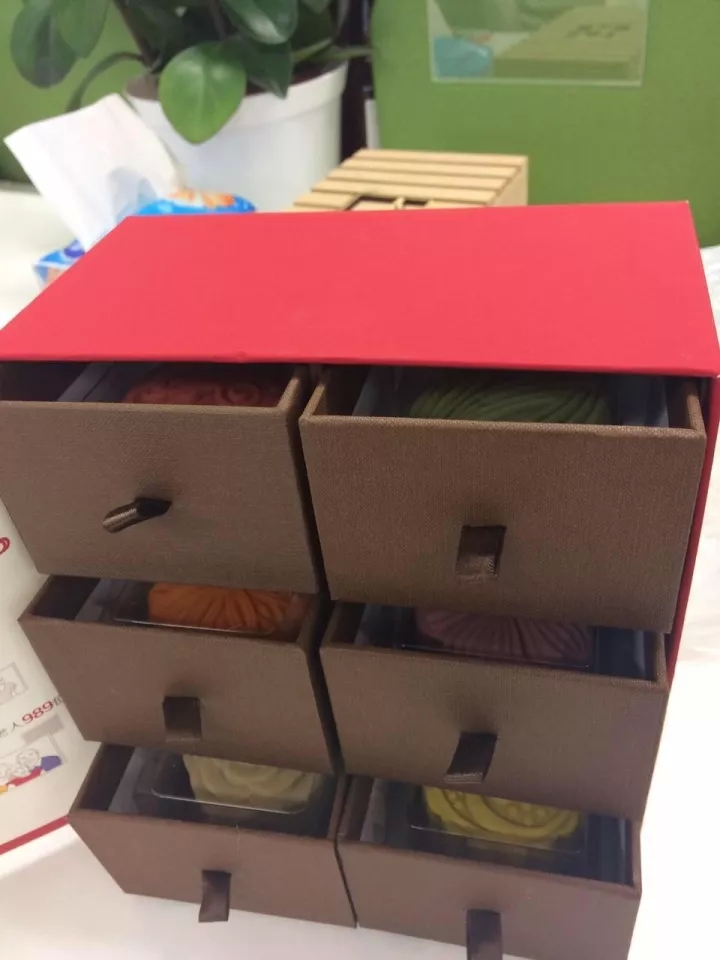 月餅盒設計成了抽屜式。上面兩個小抽屜里有月餅的制作材料,你可以自己動手diy。