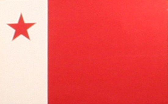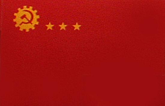 這就是五星紅旗最初的版本,該國旗樣式由曾聯松設計,剛開始該國旗方案并未被采納,后來在田漢的主張下才被收入,去除了類似蘇聯國旗的錘子鐮刀的標志。當時毛澤東中意的是一顆星一條橫杠圖案,但張治中認為一條橫杠有分裂國土、分裂革命之嫌,陳嘉庚也反對,毛澤東采納建議,遂采用五星紅旗。