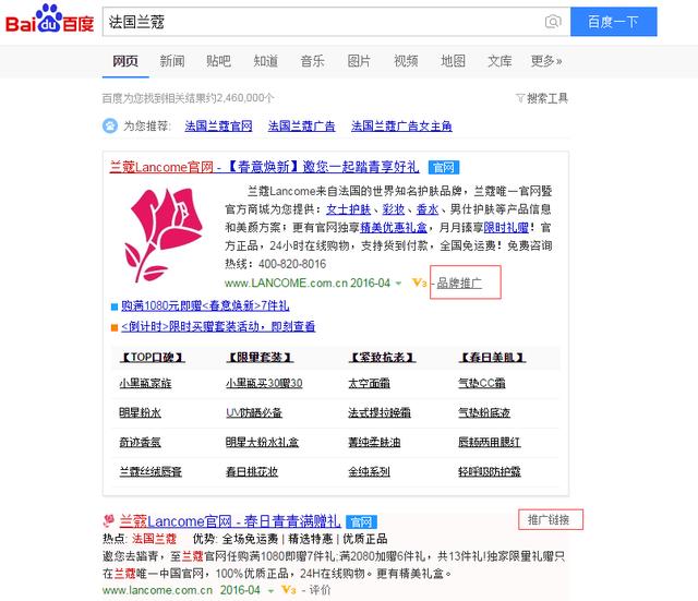 塑造品牌當(dāng)然離不開(kāi)企業(yè)網(wǎng)站了,自己的網(wǎng)站毫無(wú)疑問(wèn)是要排名在第一位的,如今企業(yè)都會(huì)利用百度品牌推廣和百度競(jìng)價(jià)推廣來(lái)包裝品牌,比如百度搜索法國(guó)蘭蔻,如圖: